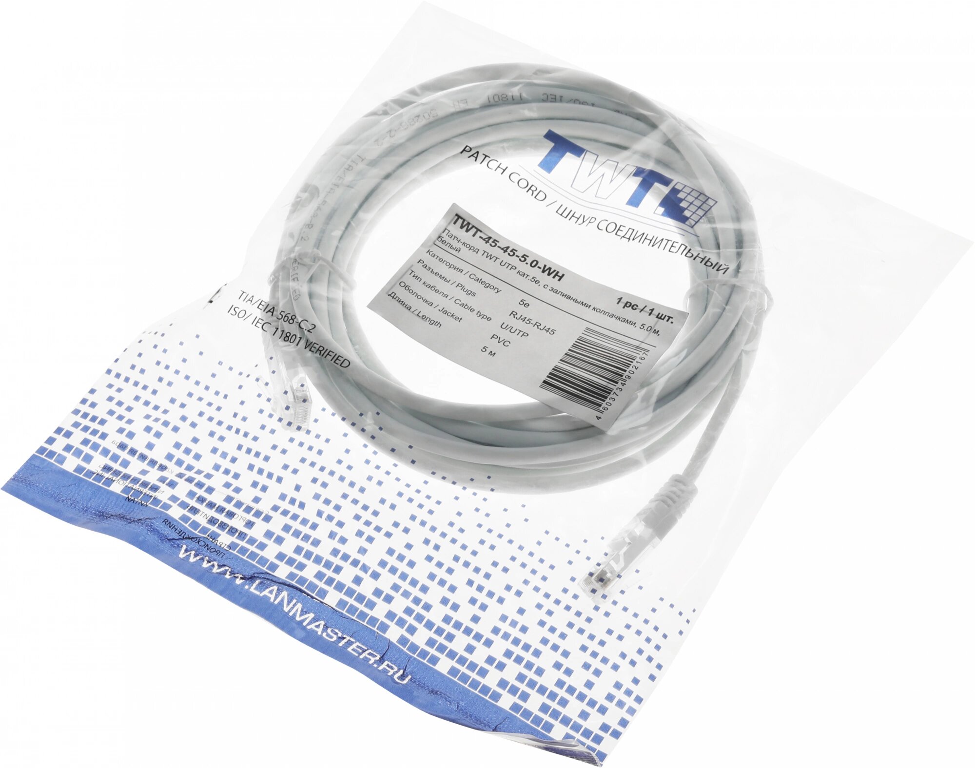 Купить Патч-корд Lanmaster TWT-45-45-5.0-WH UTP RJ-45 вил.-вилка RJ-45 кат.5E 5м белый ПВХ (уп.:1шт)