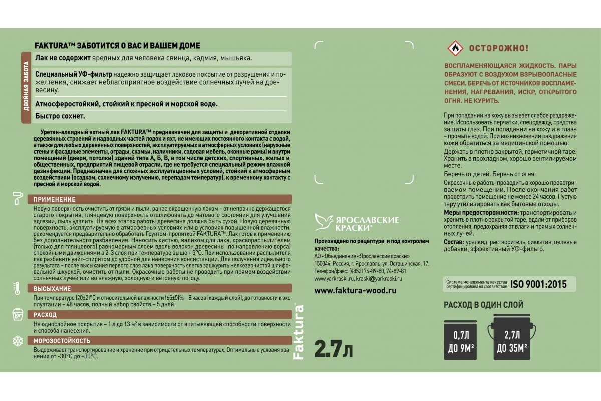 FAKTURA лак яхтный водостойкий уретан-алкидный, для вн/нар. работ, глянцевый(2,7л)