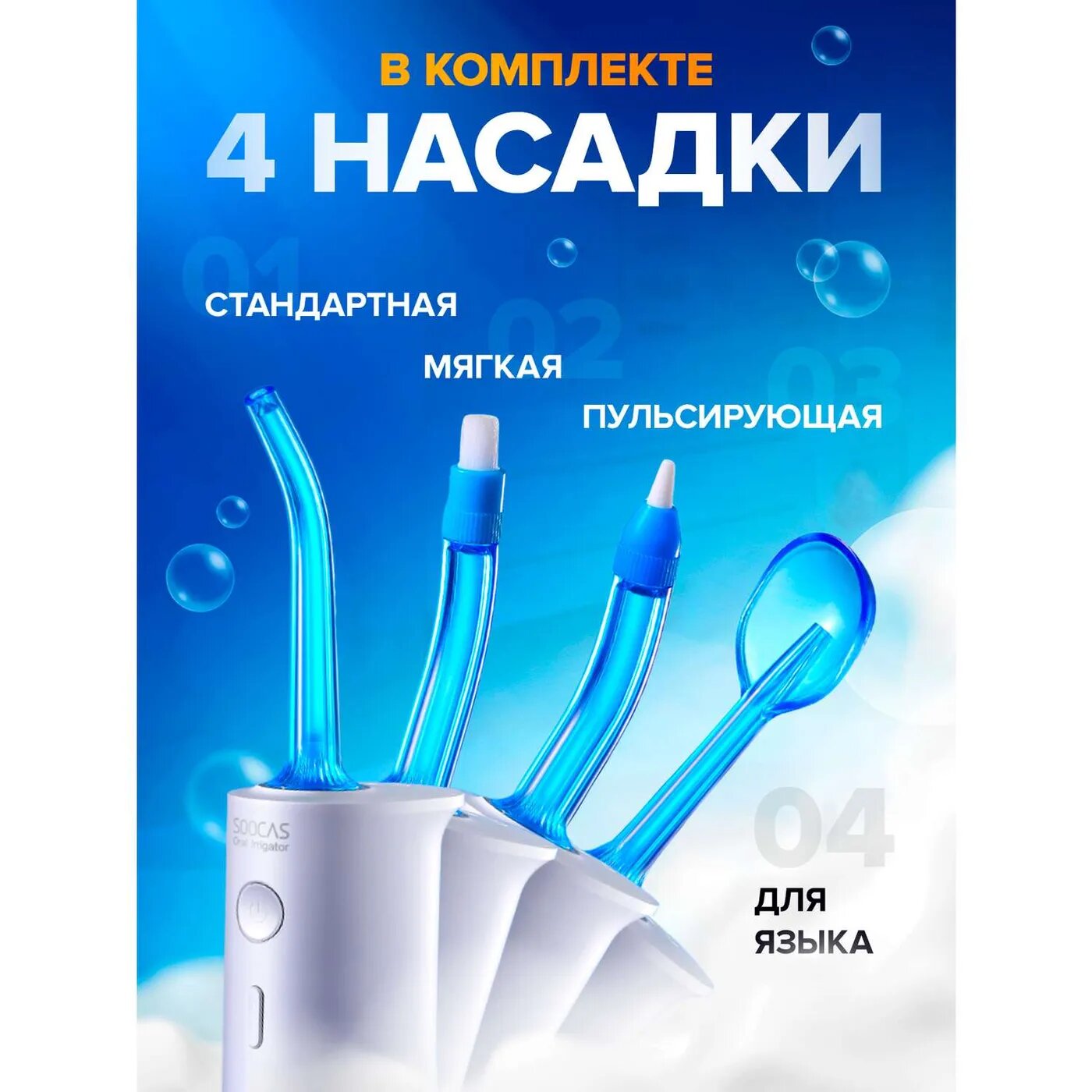 | Насадки | с насадкой для струйной чистки; с насадкой для чистки языка; с ортодонтической насадкой; с п |