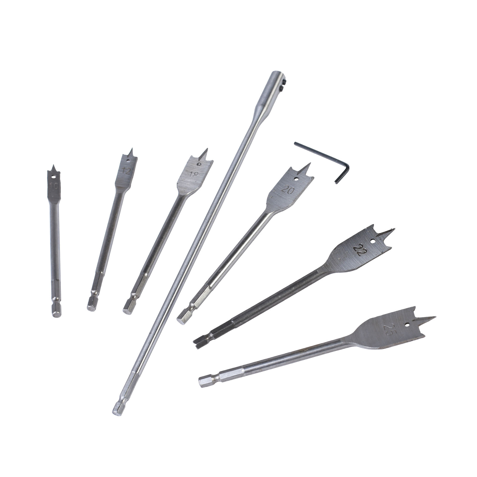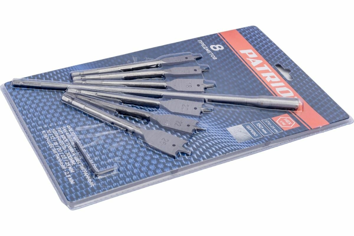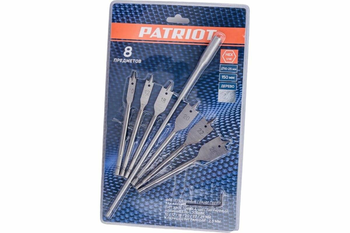 Набор сверел PATRIOT по дереву перовых 10-25 мм, удлиннитель 300мм, в блистере, 8 предметов