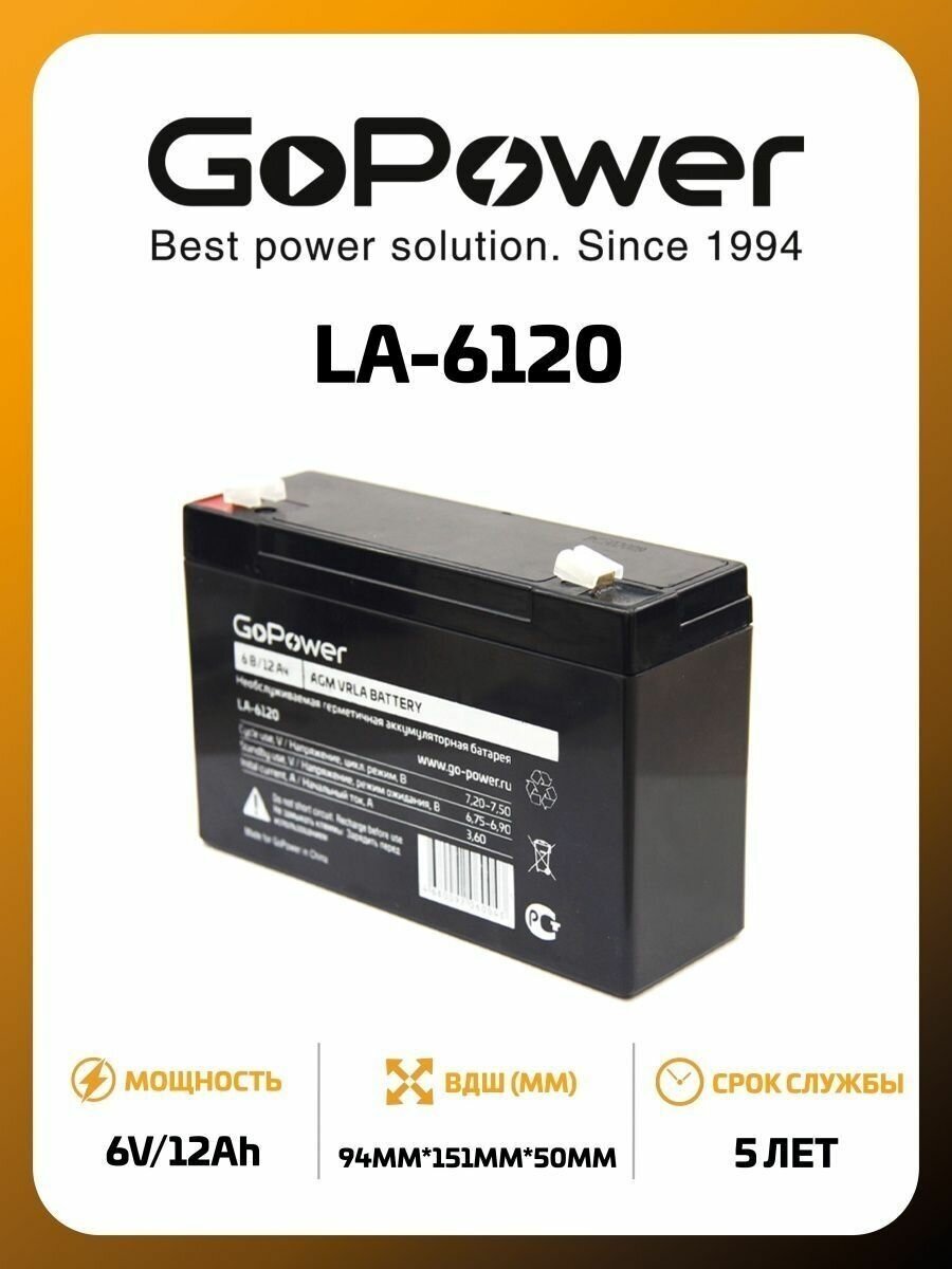 GoPower LA-6120 (6V / 12Ah) Аккумулятор свинцово-кислотный GoPower LA-6120 6V 12Ah (1/10) 00-00015322