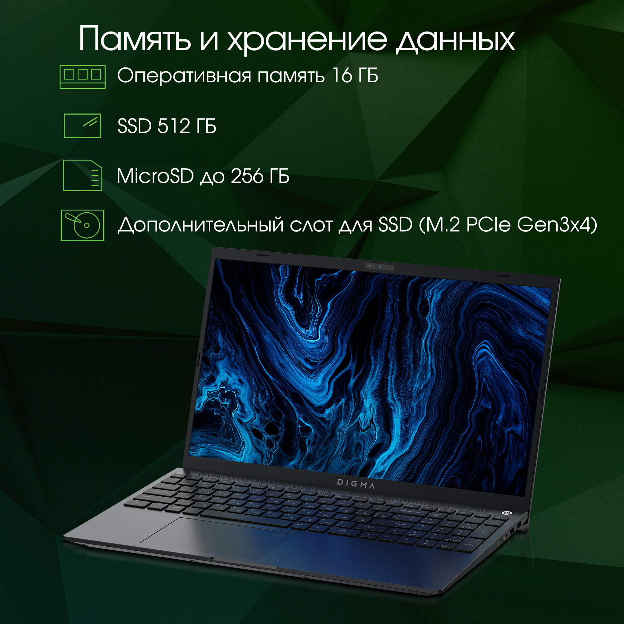 Ноутбук Digma Pro Sprint M DN15P5-ADXW02 Intel Core i5 1135G7, 2.4 GHz - 4.2 GHz, 16384 Mb, 15.6" Full HD 1920x1080, 512 Gb SSD, DVD нет, Intel Iris Xe Graphics, Windows 11 Professional, темно-серый, 1.82 кг, DN15P5-ADXW02