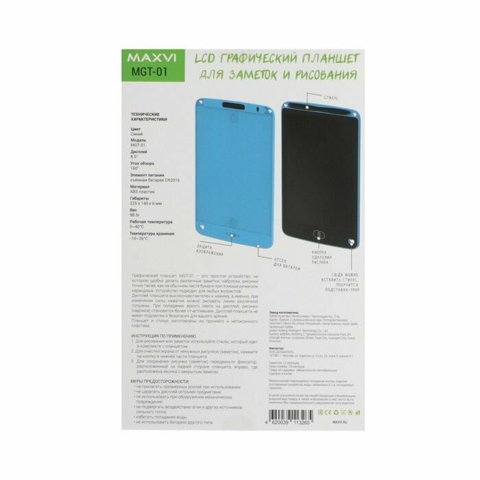 Maxvi Графический планшет для рисования и заметок LCD Maxvi MGT-01, 8.5”, угол 160°,CR2016, синий интересное: