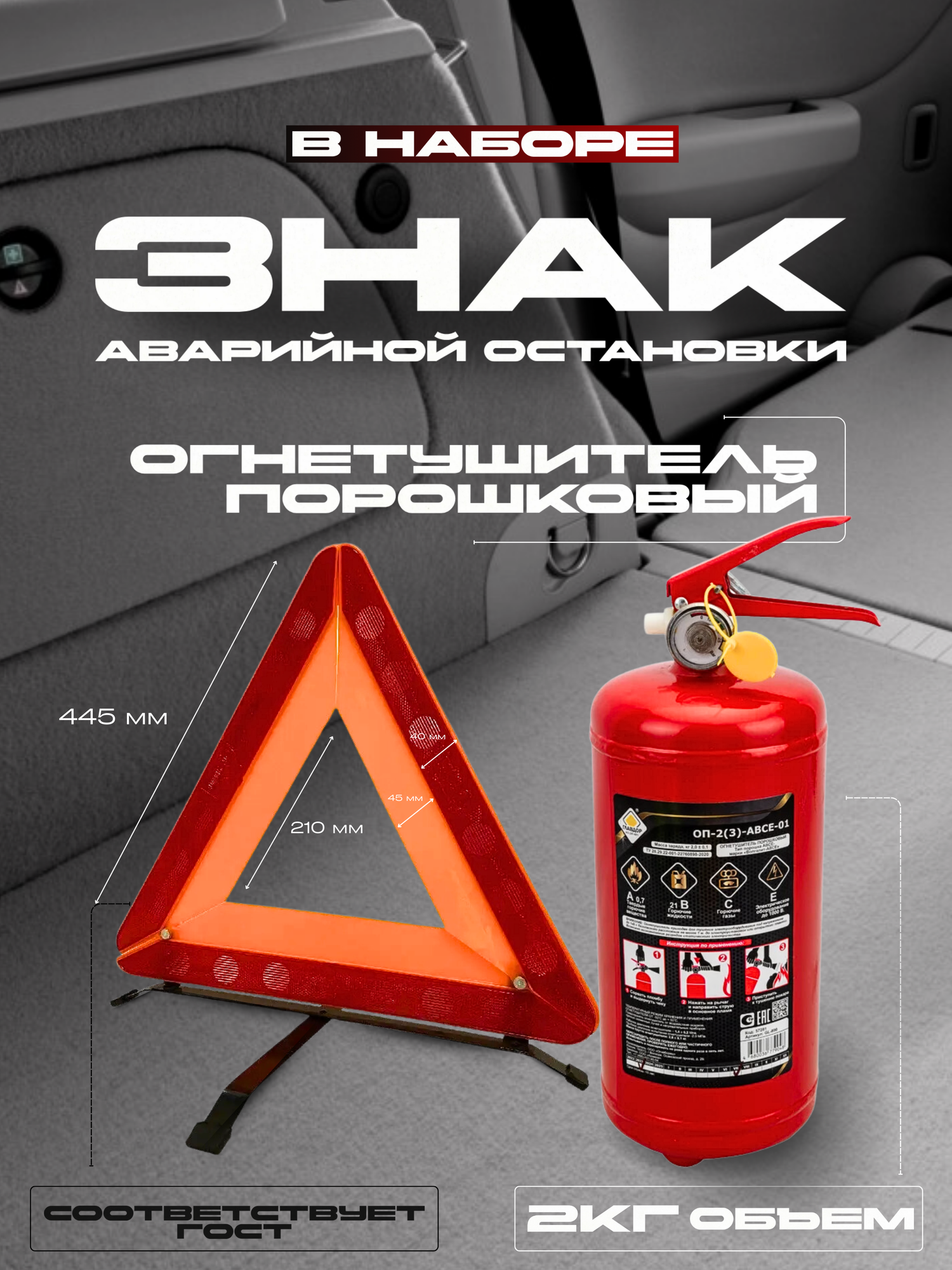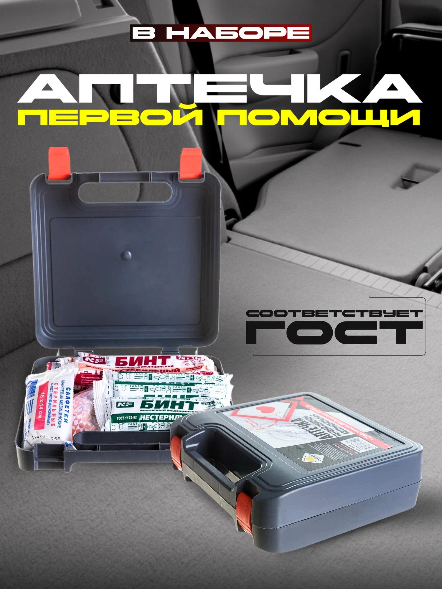 | В наборе | аптечка / жилет светоотражающий / знак аварийной остановки / огнетушитель / перчатки / трос буксировочный / маска / пакеты для колес / противооткатный башмак / сумка |