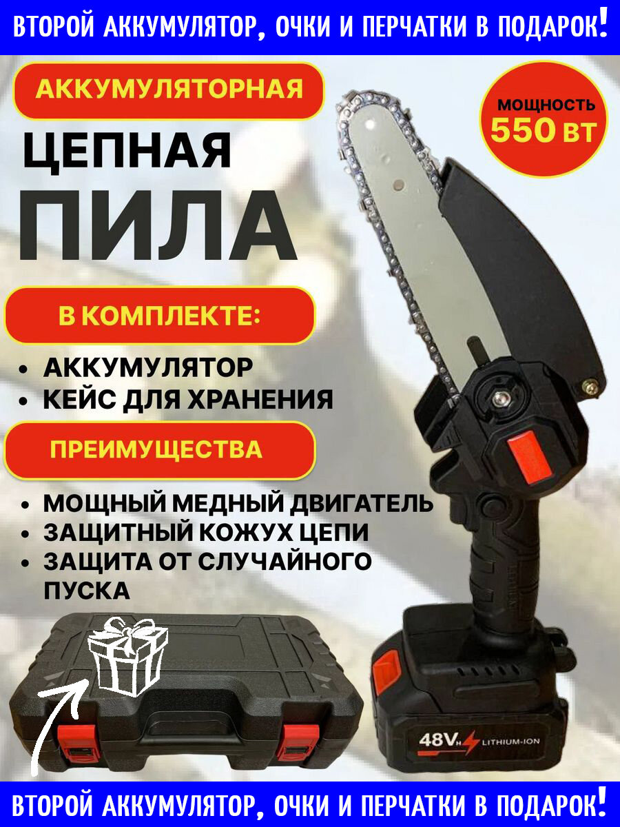 Аккумуляторная цепная пила; Электропила; Два аккумулятора 48Vh (21 вольт каждый) в комплекте, в кейсе интересное: