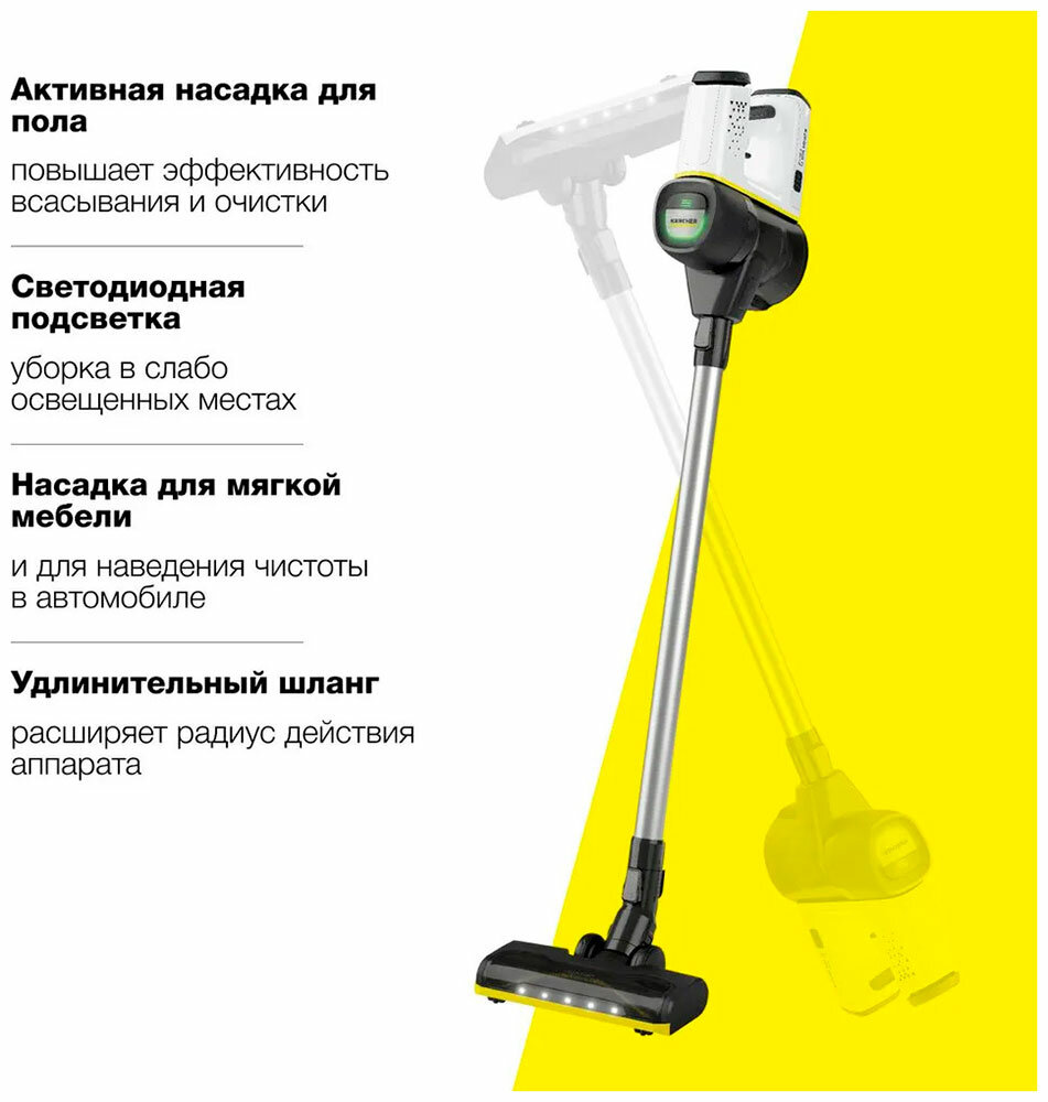 Пылесос вертикальный беспроводной Karcher VC 6 Cordless ourFamily Pet 1.198-673.0, режим Boost, безмешковая система фильтрации, подсветка, время автономной работы до 50 мин, белый