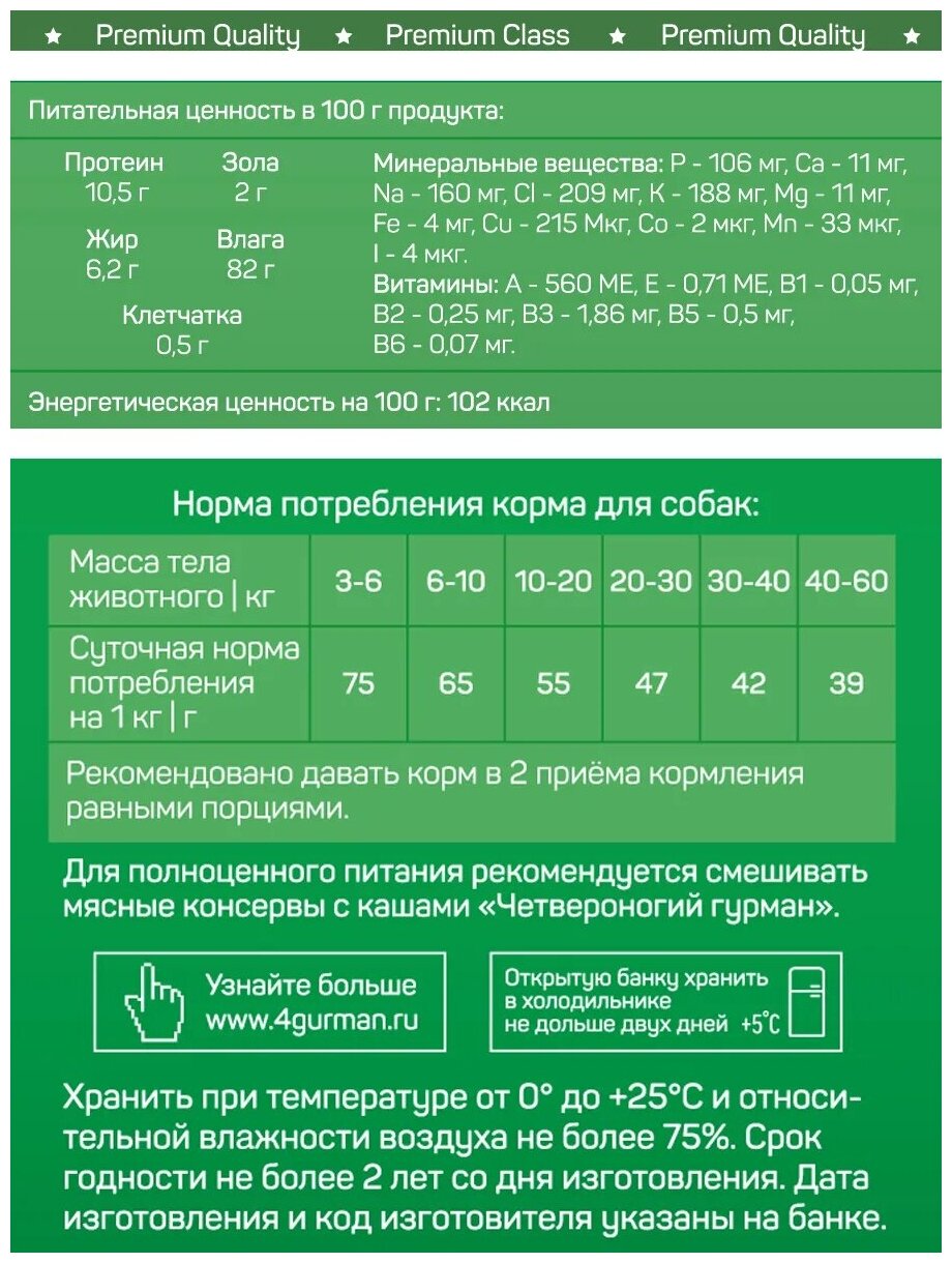 | Пищевая ценность | на 100 гр продукта: сырой протеин - не менее 11,5 гр, сырой жир - не более 11 гр, влага – не более 82 гр, клетчатка - не более 0,5 гр, сырая зола - не более 2 гр, фосфор - не более 0,9 гр, кальций – не более 0,2 гр, витамины А, Д, Е, омега-3 – не менее 0,03 гр, омега-6 – не менее 0,005 гр, таурин - 0,2 гр |