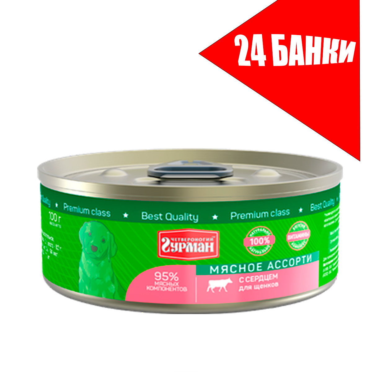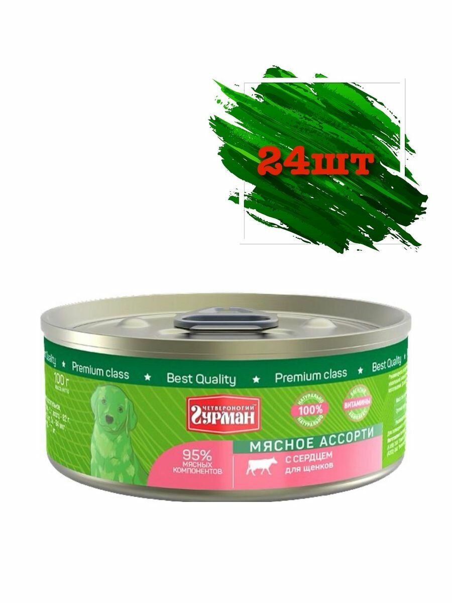 Четвероногий Гурман для щенков Мясное ассорти с Сердцем,консервы 100г (24 банки)