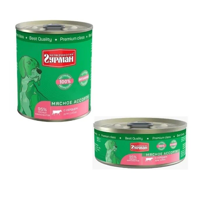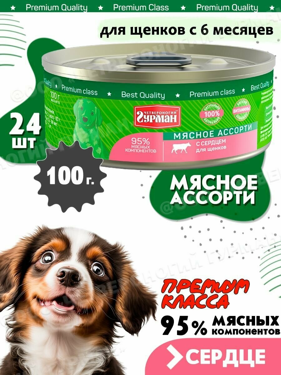 Корм консервированный для щенков Четвероногий Гурман "Мясное ассорти с сердцем", 100 г х 24 шт