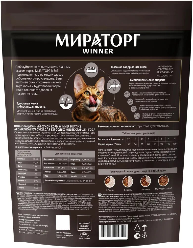 Мираторг WINNER MEAT сухой корм для взрослых кошек, с ароматной курочкой - 750 г