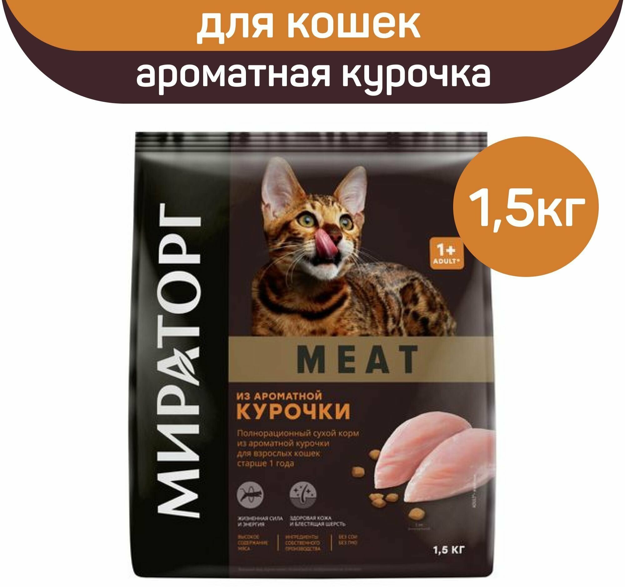 Сухой корм Мираторг Meat с ароматной курочкой для взрослых кошек старше 1 года, 1,5 кг