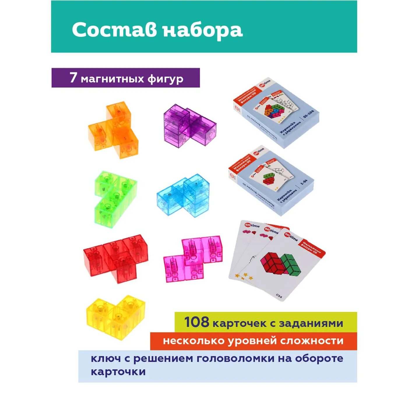Магнитный головоломка - конструктор On Time "Фигуры 3D", для развития логики, 7 элементов, карточки на 108 заданий в комплекте, игры в дорогу