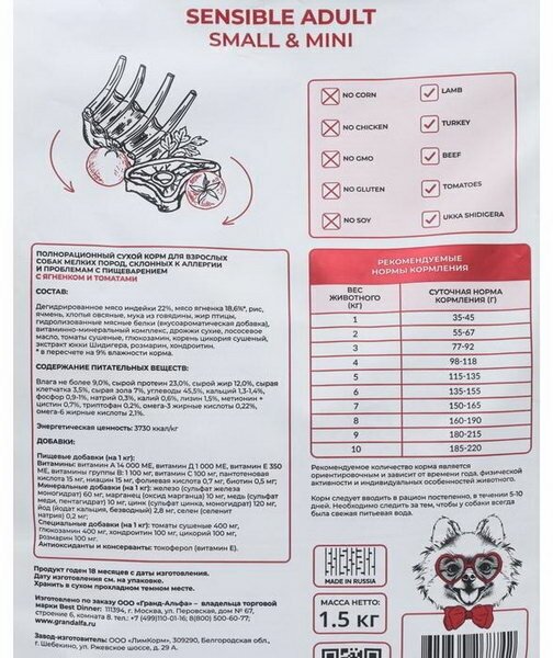 Сухой корм Best Dinner Adult Sensible Mini для собак мелких пород склонных к аллергии и проблемам с пищеварением, Ягненок и томаты 1,5 кг