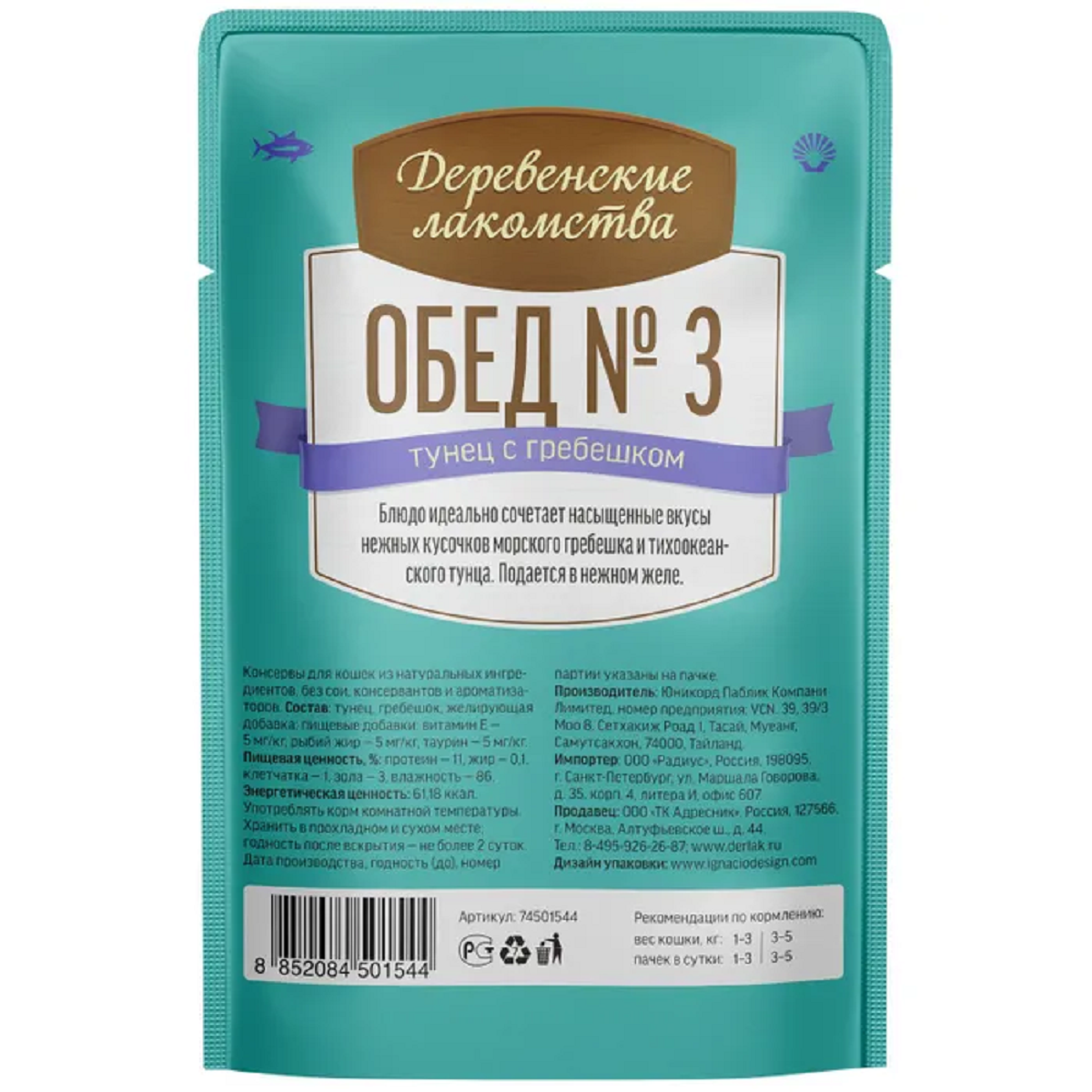 Влажный корм для кошек Деревенские лакомства Обед №3, с тунцом, с гребешком 50 г (кусочки в желе)