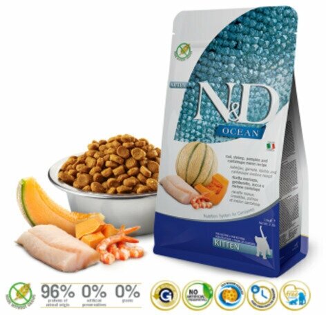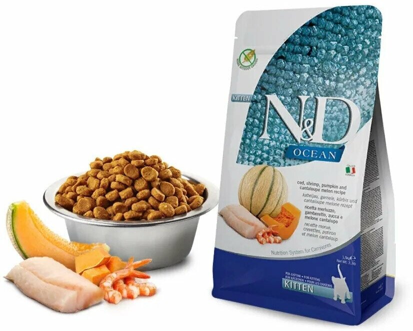 Купить FARMINA CAT N&D OCEAN KITTEN COD, SHRIMP, PUMPKIN & CANTALOUPE MELON беззерновой для котят, беременных и кормящих кошек с треской, креветками, тыквой и дыней (1,5 кг)