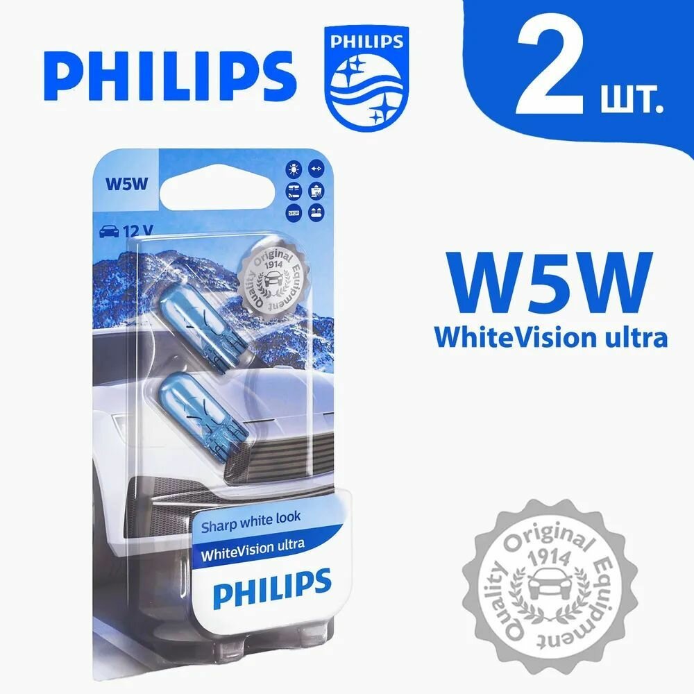 Лампа автомобильная Philips White Vision ultra W5W 12V-5W (W2,1x9,5d) (абсолютно белый свет), бл. 2ш