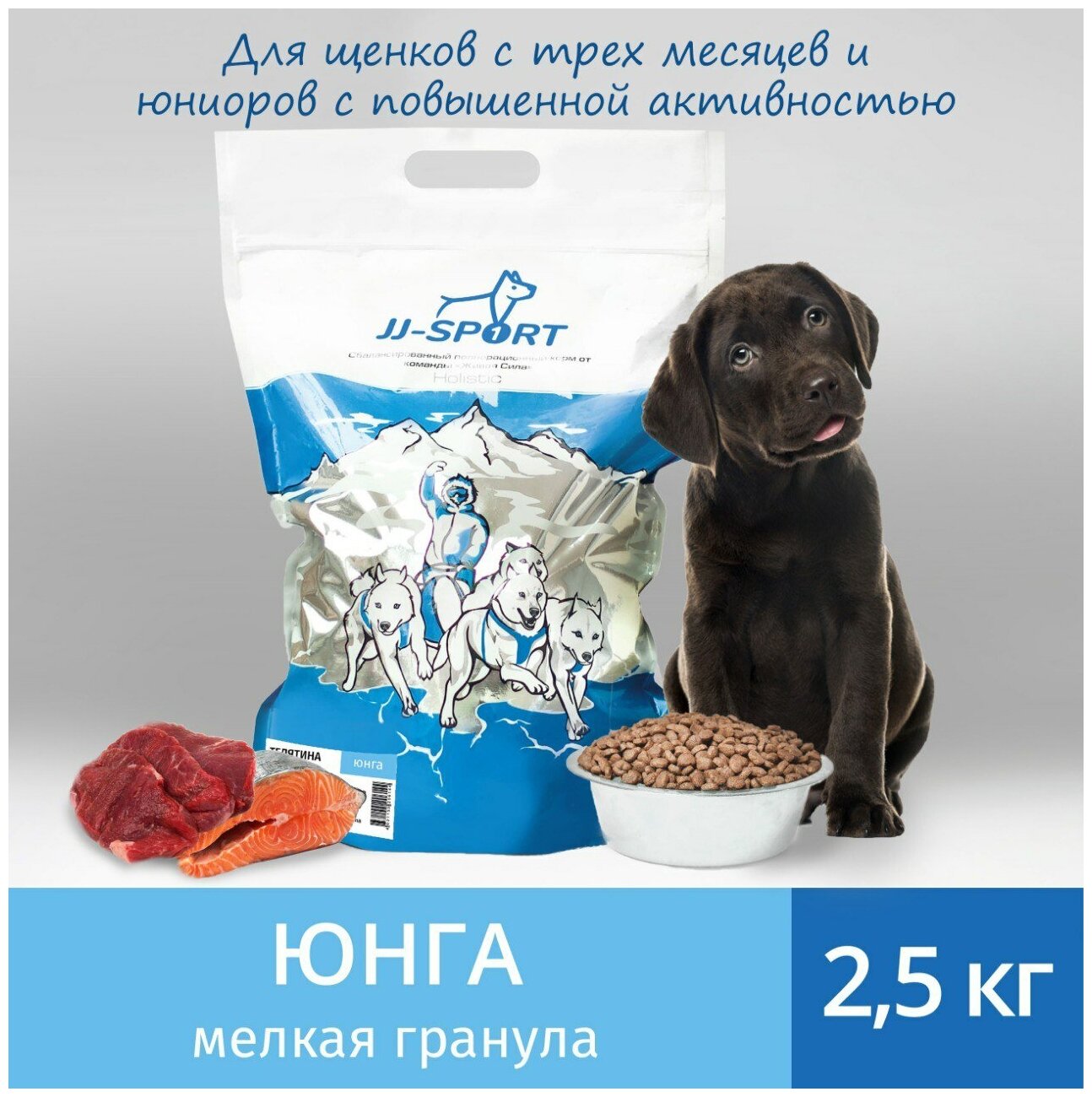 Сухой полнорационный корм JJ-SPORT "Юнга" Живая Сила для щенков с 3 месяцев и юниоров, с телятиной и лососем, крупная гранула 2,5 кг