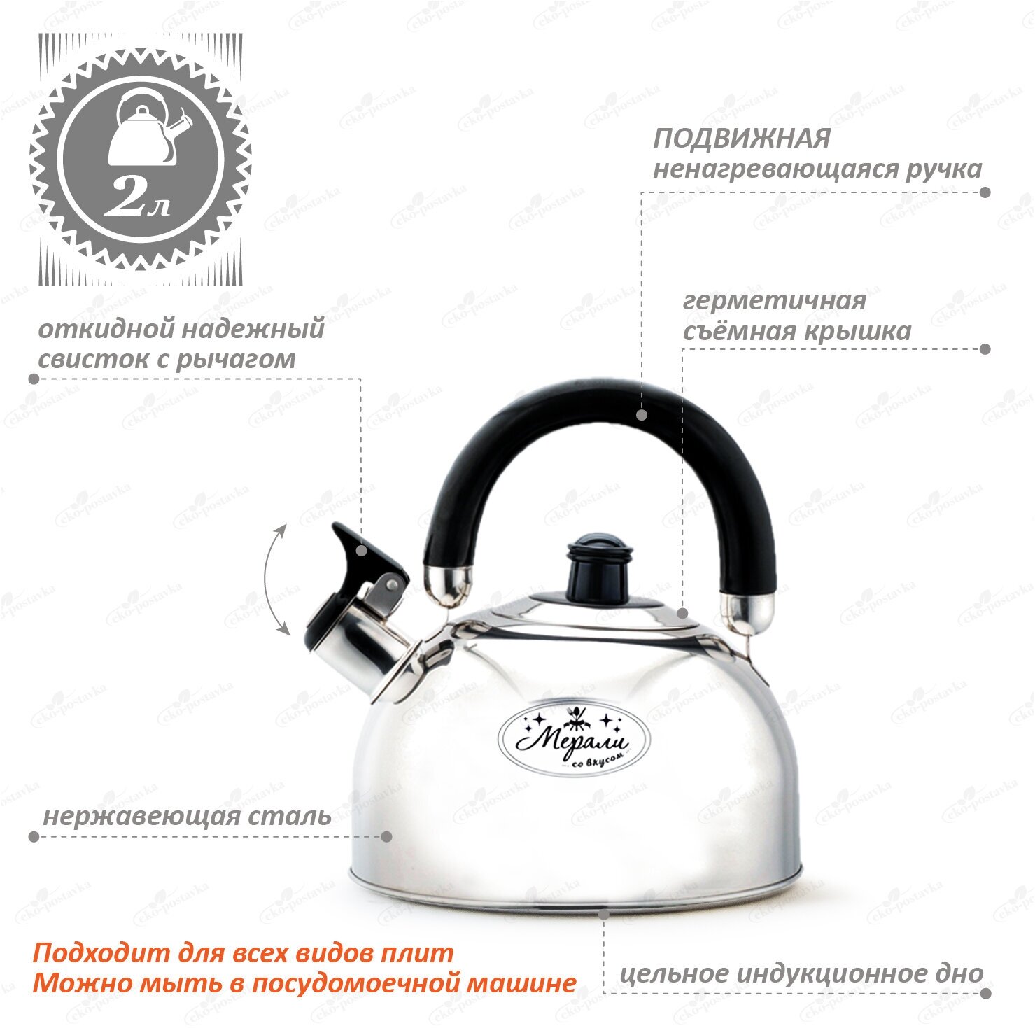 Чайник нержавеющий со свистком Мерали 2 литра для всех видов плит интересное: