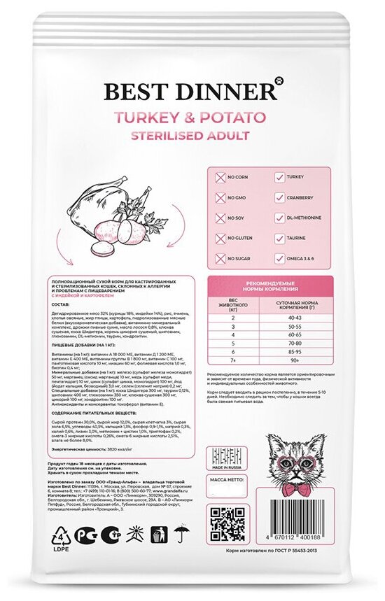 | Дополнительная информация | специальные добавки (на 1 кг): юкка шидигера 300 мг, таурин 0,12%, шиповник 400 мг, глюкозамин 350 мг, клюква сушеная 300 мг, хондроитин 100 мг, цикорий 100 мг |