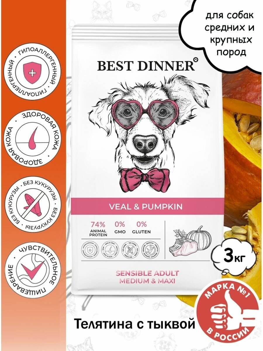Best Dinner Adult Sensible Medium & Maxi Veal & Pumpkin 3 кг сухой корм для собак средних и крупных пород склонных к аллергии и проблемам с пищ-ем с Телятиной и тыквой