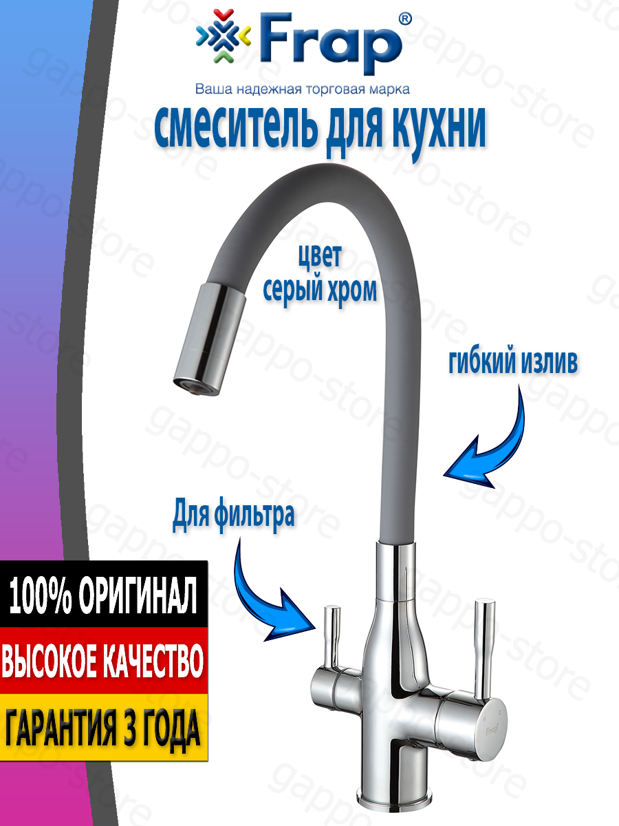 Смеситель для кухни 35к F4396 FRAP гибкий излив, с вых. для питьевого фильтра, серый